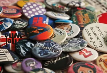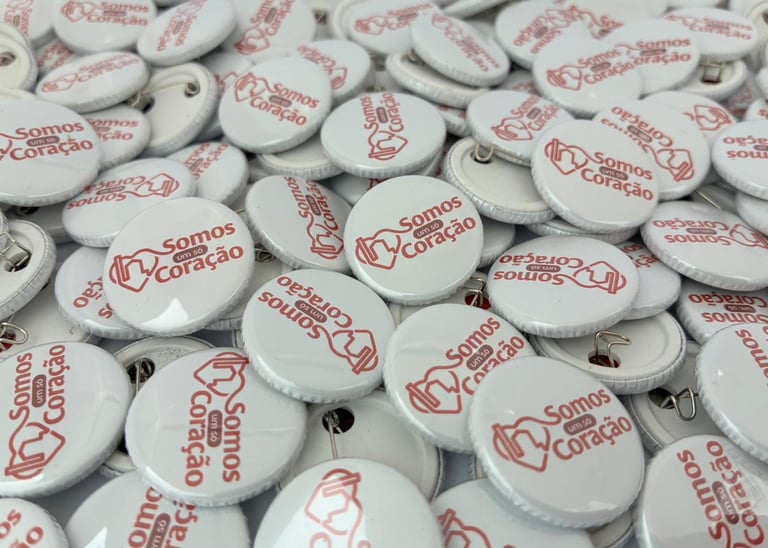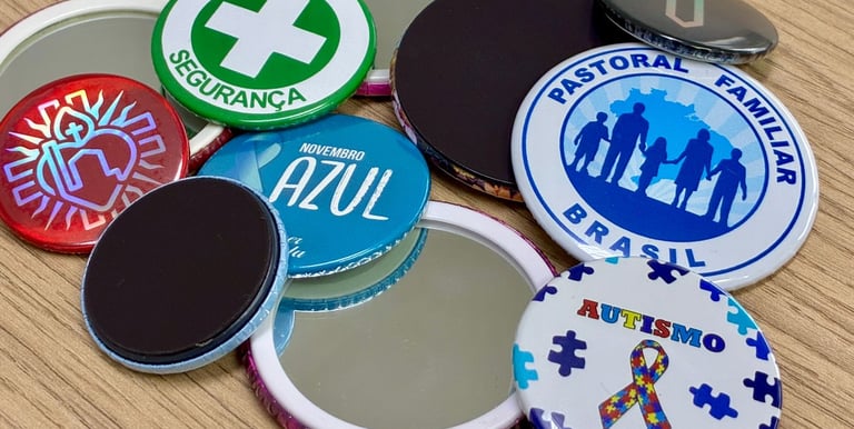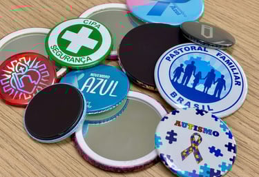 Forma criativa de expressar ideias, valores e sentimentos. Com impressão de alta qualidade, acabamento em PVC com espelho ou imã. Tamanhos disponíveis: 3,5cm - 4,5cm e 5,5cm.